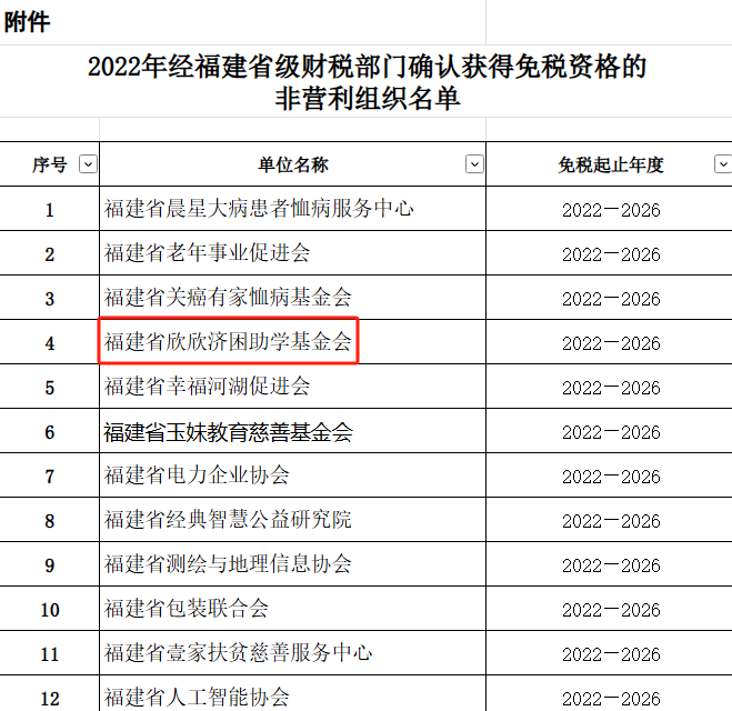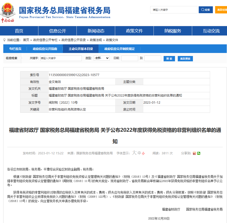 2022年经福建省级财税部门确认获得免税资格的非营利组织名单